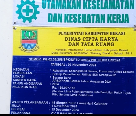 Proyek dengan nomor : PG.02.02/256/SPK/UPTD BANG WIL ll/DCKTR/2024, Kegiatan Rehabilitasi Sedang/Berat Sarana, Prasarana Utilitas Sekolah, lokasi SDN Sirnajaya 02 Desa Sirnajaya, Kec. Serang Baru, sumber dana APBDP Tahun Anggaran 2024 dengan Nilai Rp. 159.097.152, dan di kerjakan oleh CV.Iham Putra Mandiri dengan waktu pelaksanaan 45 hari kalender mulai 1 November 2024 sampai 15 Desember 2024.