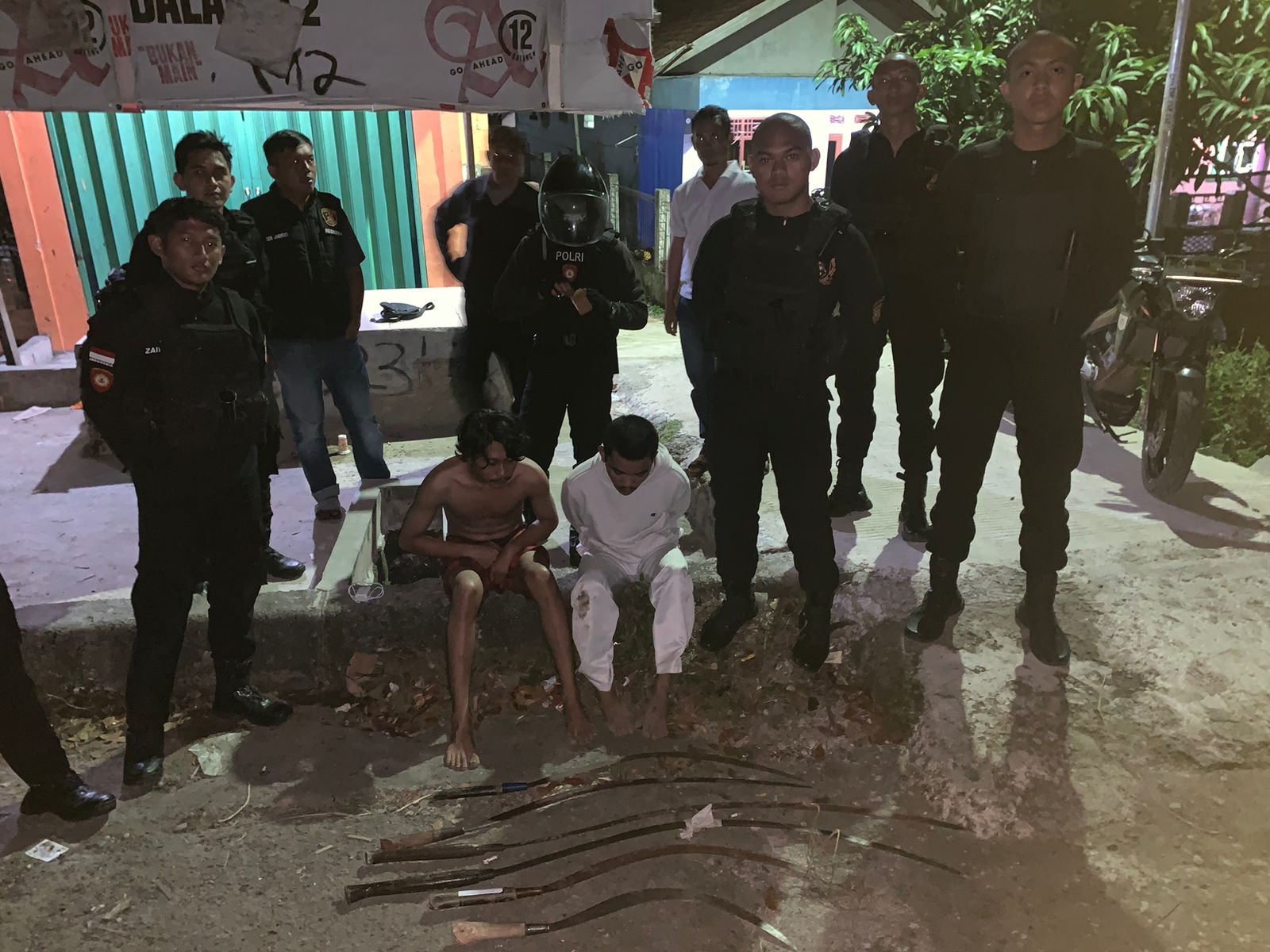 Berdasarkan laporan masyarakat, sejumlah remaja berkumpul di lokasi dengan indikasi kuat akan melakukan aksi tawuran. Dalam patroli tersebut, polisi tidak hanya berhasil membubarkan kelompok tersebut tetapi juga mengamankan dua remaja dengan inisial D.P. (21) dan D.A.M. (17). Selain itu petugas juga menyita barang bukti berupa tujuh unit sepeda motor, dua telepon genggam, dan enam senjata tajam yang diduga akan digunakan dalam tawuran.