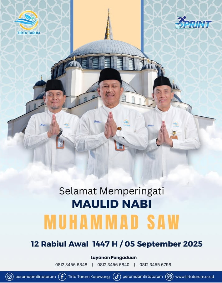 Direksi Perumdam Tirta Tarum Karawang mengucapkan selamat hari Maulid Nabi Muhammad SAW dan berharap bahwa momen ini dapat membawa berkah dan kebaikan bagi kita semua. Semoga kita dapat meneladani sifat-sifat mulia Nabi Muhammad SAW dan meningkatkan kualitas diri kita sebagai individu dan masyarakat.