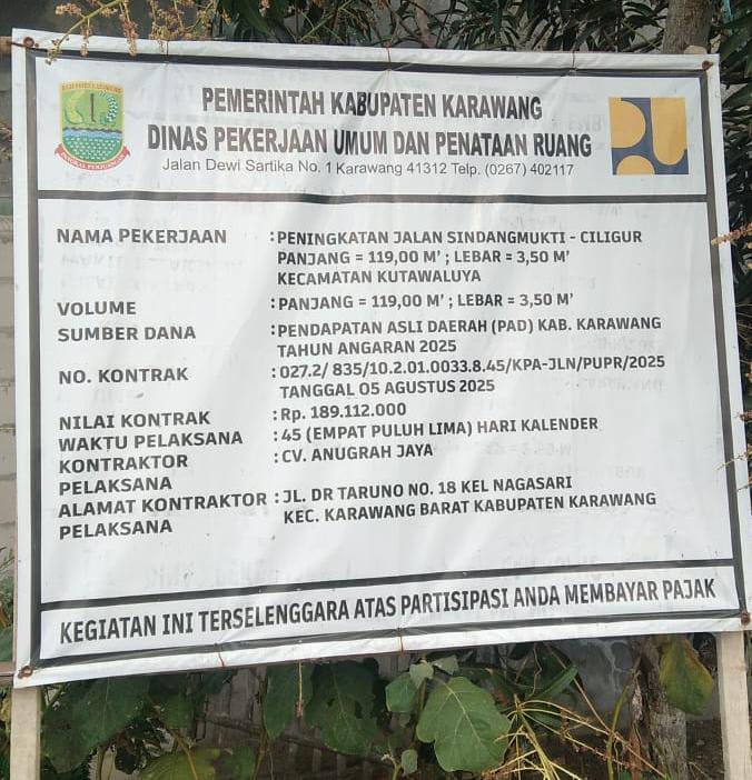 Karawang 14 -september 2025 proyek pengecoran jalan di Desa Sindang Mukti, Kecamatan Kutawaluya, Kabupaten Karawang, menuai sorotan warga. Meski menelan anggaran sekitar Rp189.112.000 dan dikerjakan oleh CV Anugrah Jaya, kualitasnya dipertanyakan.